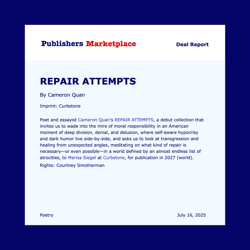 “Who apologizes to whom?” is the presiding question of Cameron Quan Louie’s Apology Engine, a smart and poignant collection of prose poems that expertly toe the line between gallows humor and a series of sincere apologies in the making. Just as an engine is powered by the assemblage of its parts, Louie’s plunge into the world of apologies takes us from the author’s guilt over dissecting a squid for a school assignment to the apology that would never arrive from the white man positioning himself as an expert on the author’s Chinese background. Each instance of sorry builds into a seemingly unstoppable motion through which no amount of apology would ever be replete. The only solution, Louie weighs, seems to be to pull the engine apart, to let the vehicle break down. What imperfect lessons will we learn then? As for me, I love being so thoroughly schooled by this clever and innovative collection, which reminds me that yes, sometimes repair means have to first fall apart.